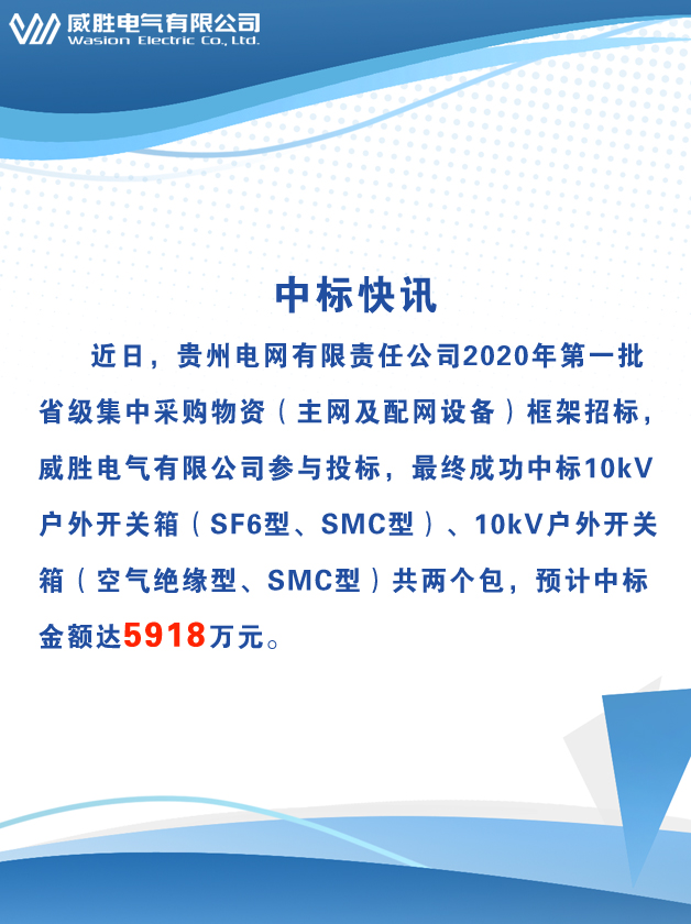 2020年4月22日,貴州電網有限責任公司2020年第一批省級集中采購物資(主網及配網設備)框架招標,威勝電氣有限公司參與投標,最終中標10kV戶外開關箱(SF6型、SMC型)、10kV戶外開關箱(空氣絕緣型、SMC型),預計中標金額達5918萬元。