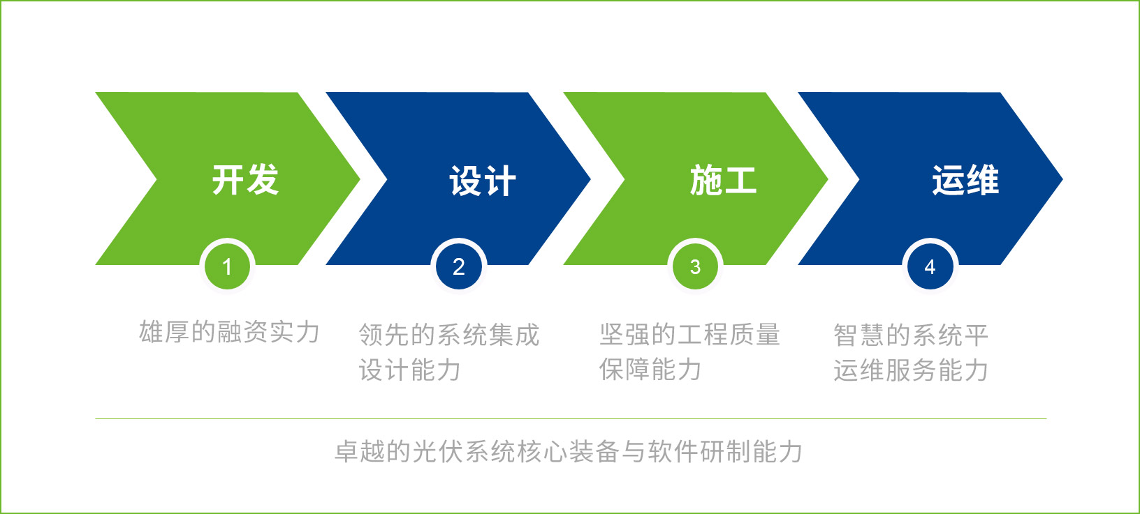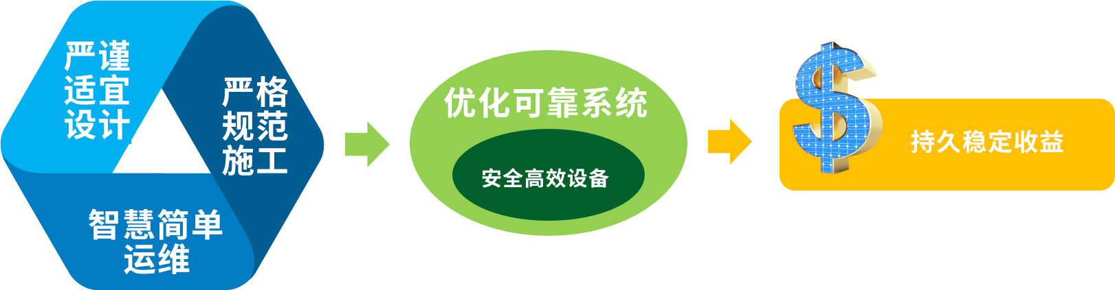 我們通過嚴謹適宜的設計、嚴格規范的施工和智慧簡單的運維,建設并運營一個由安全高效的設備組成的優化可靠的新能源發電系統,希望業主能收獲持久穩定的收益。