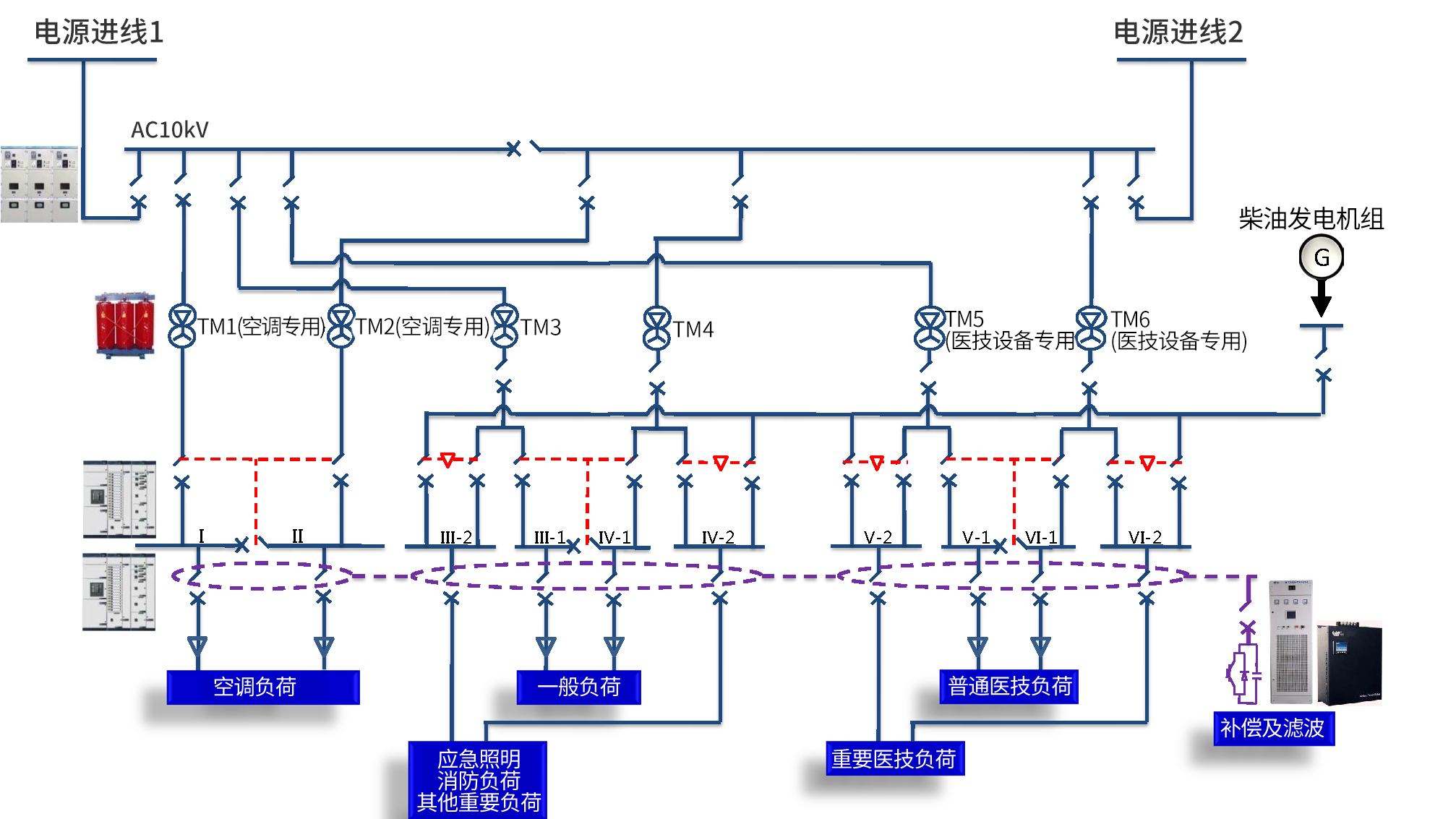 根據醫院配電系統的特殊性,我司設計了高可靠性、高安全性的配電系統。中低壓配電開關柜可選用施耐德或西門子授權柜;特殊醫療場所,如手術區等,可選用高可靠性的雙電源切換箱;針對精密醫療設備,對電能質量要求特別高的場合,可選用具有完美濾波功能的壁掛式有源濾波裝置,節省占用空間,也方便后期改造擴容。