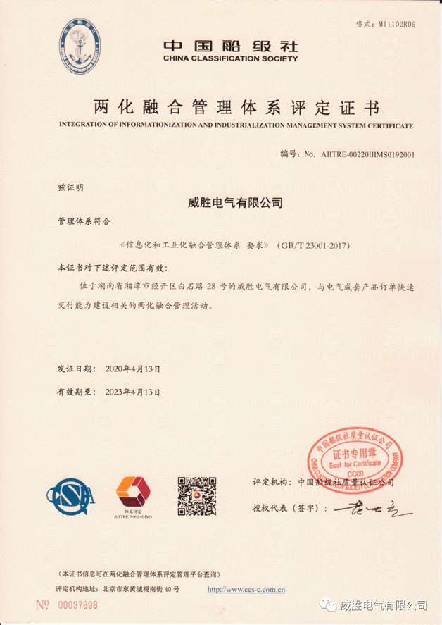 經過中國船級社專家來司評估現場審核工作,最終威勝電氣順利通過兩化融合體系評估認證。并于2020年4月13日收到國家工信部簽發的兩化融合管理體系評定證書。