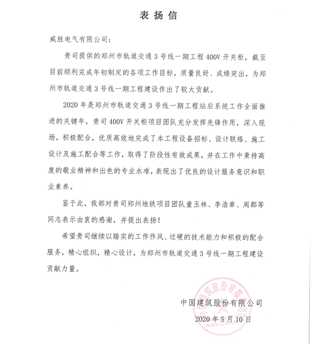 2020年5月10日,威勝電氣收到了鄭州市軌道交通項(xiàng)目業(yè)主方中國建筑股份有限公司發(fā)來的表揚(yáng)信,感謝我司為鄭州市軌道交通3號(hào)線一期工程建設(shè)所做出的較大貢獻(xiàn)。