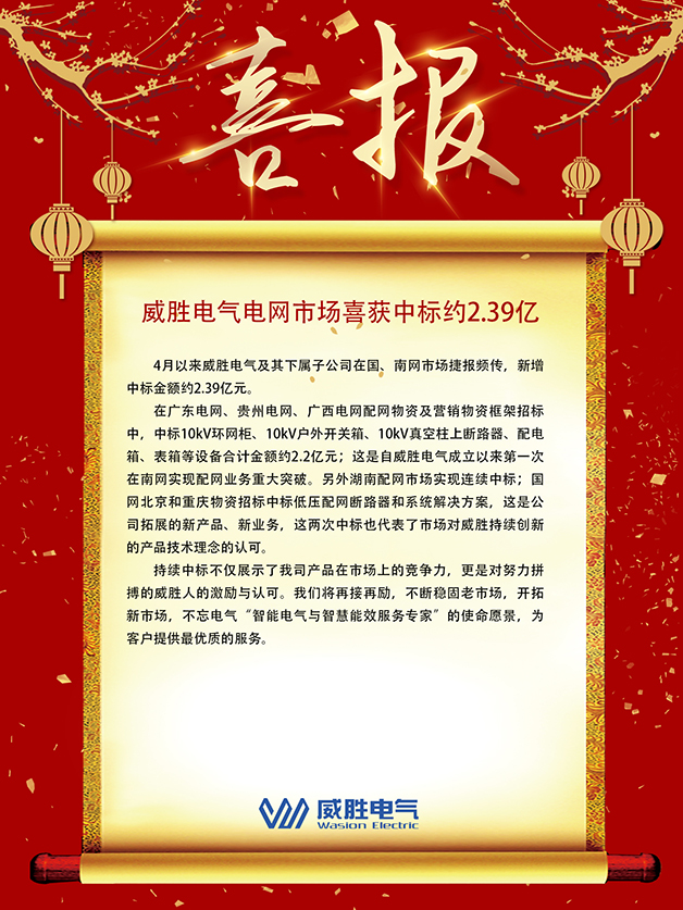 持續(xù)中標(biāo)不僅展示了我司產(chǎn)品在市場上的競爭力,更是對努力拼搏的威勝人的激勵與認(rèn)可。我們將再接再勵,不斷穩(wěn)固老市場,開拓新市場,不忘電氣“智能電氣與智慧能效服務(wù)專家”的使命愿景,為客戶提供優(yōu)質(zhì)的服務(wù)。
