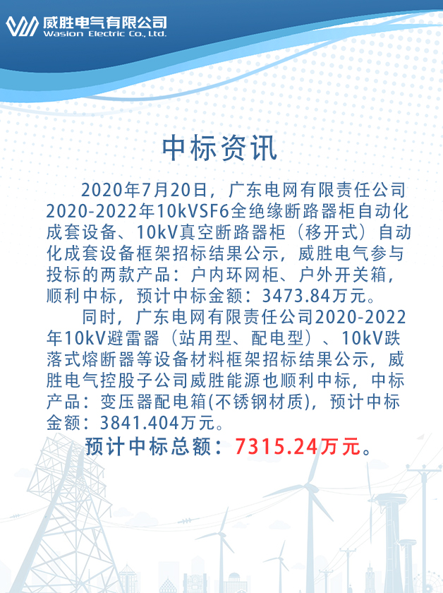 2020年7月20日,廣東電網(wǎng)有限責(zé)任公司2020-2022年10kVSF6全絕緣斷路器柜自動化成套設(shè)備、10kV真空斷路器柜(移開式)自動化成套設(shè)備框架招標(biāo)結(jié)果公示,威勝電氣參與投標(biāo)的兩款產(chǎn)品:戶內(nèi)環(huán)網(wǎng)柜、戶外開關(guān)箱順利中標(biāo),預(yù)計(jì)中標(biāo)金額:3473.84萬元。同時(shí),廣東電網(wǎng)有限責(zé)任公司20202022年10kV避雷器(站用型、配電型)、10kV跌落式熔斷器等設(shè)備材料框架招標(biāo)結(jié)果公示,威勝電氣控股子公司惟遠(yuǎn)能源也順利中標(biāo),中標(biāo)產(chǎn)品:變壓器配電箱(不銹鋼材質(zhì)),預(yù)計(jì)中標(biāo)金額:3841.404萬元。預(yù)計(jì)中標(biāo)總額:7315.24萬元