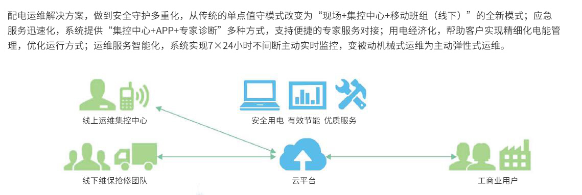 全新的配電一站式運維服務,采用線上監測分析加線下運維服務的模式,為廣大用戶提供變配電站智能化托管運維支撐服務、“企業電網云服務平臺”解決方案、能效管理平臺建設及運營管理、以及用戶電力需求側的各類增值服務。在使配電更安全、服務更高效的同時,降低能源消耗,提升用能效率。